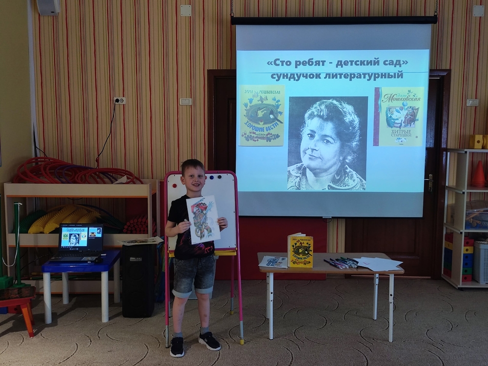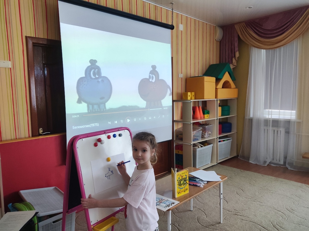 Особую радость подарил мультфильм «Бегемотик» по стихотворению писательницы. Вместе с библиотекарем дошколята обсудили, кого встретил бегемотик, почему грустил и как здорово, когда друзья рядом. А затем каждый ребёнок нарисовал своего неповторимого бегемотика.